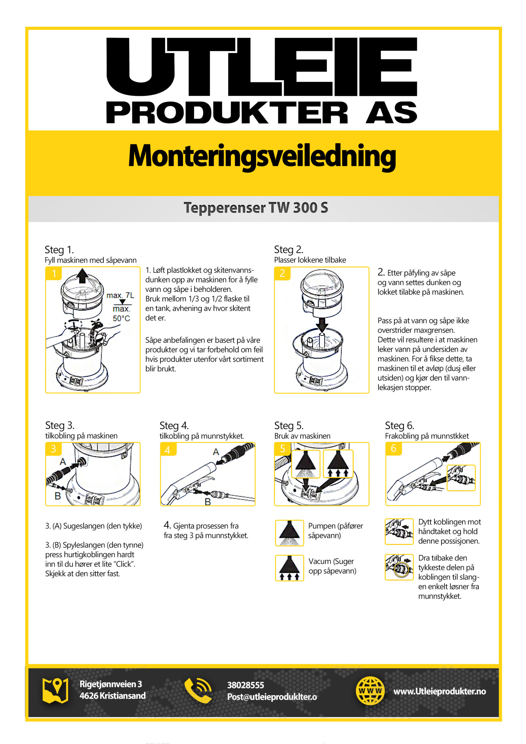 Cleanfix TW300S er en kompakt og multifunksjonell møbel og tepperensmaskin designet for effektiv rengjøring av tepper, møbler, tekstiler og gulvmatter. Den er produsert av Cleanfix, et sveitsisk selskap kjent for robuste rengjørings maskiner. TW300S modellen er for private samt kommersielt bruk. Vanlige brukesområder kan være hus, hoteller, skoler, sykehus, fabrikker, butikker, kontorer og utleievirksomheter. Modellen er en «kompakt kraftpakke» som passer til de fleste rengjøringsoppgavene. Maskinen er ideell for mindre til mellomstore områder og gir effektiv dyptrensing ved å sprøyte rengjøringsløsning inn i overflaten og deretter suge opp skitt og væske.
